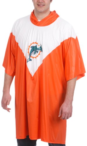 Miami Dolphins vinyl hooded poncho with vibrant color film and team logo printed on the white yoke; one size fits most.