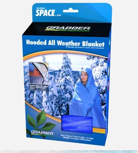 The Original Space Brand Hooded All-Weather Blanket is a combination Blanket/Poncho for outdoor use. Utilizing the proven thermal and weather resistant benefits of our All-Weather Blanket, this product incorporates a full hood and hand covering pockets for ease of use in inclement weather conditions.Easy to CleanFull BindingLightweightWaterproofWindproofCompactDurableGrommetsFlexible to -20 degreesThe Hooded All-Weather Blanket measures 5' x 7' including the hood. The two upper corners have fitted inserts for your hands, even with gloves, allowing you to grasp and draw the All-Weather Blanket inward toward your body. The securely anchored reflective hood deters heat loss from the top of the head, and is wide enough to accomodate a hat. Sit or squat to concentrate the core body heat, draw the blanket in close and move often to improve circulation. Also useful as an effective measure to help prevent post-trauma shock after an accident or disaster. Silver on reverse side.